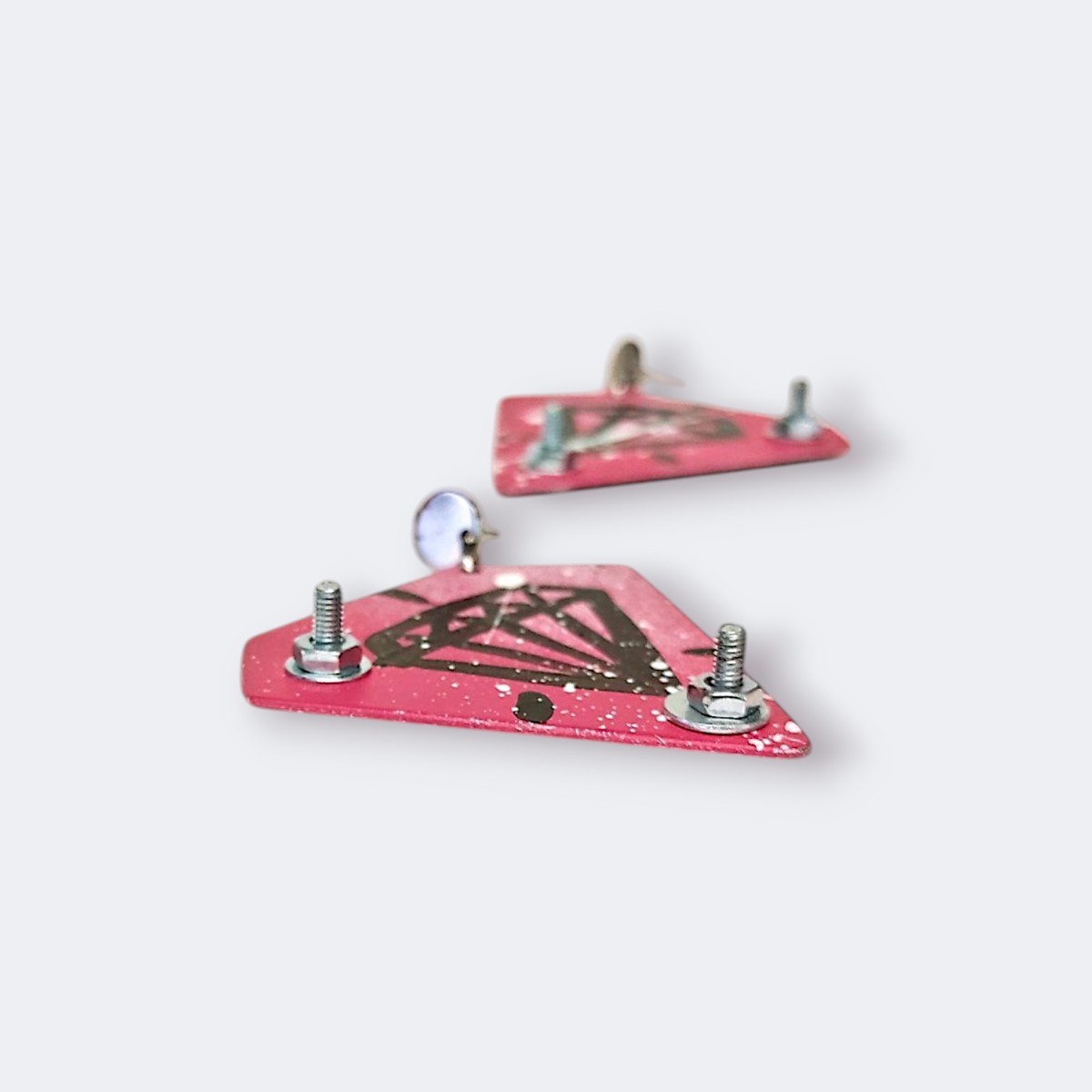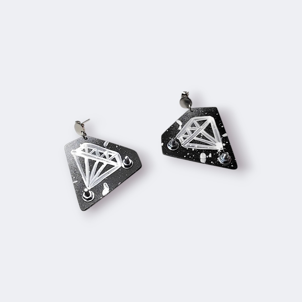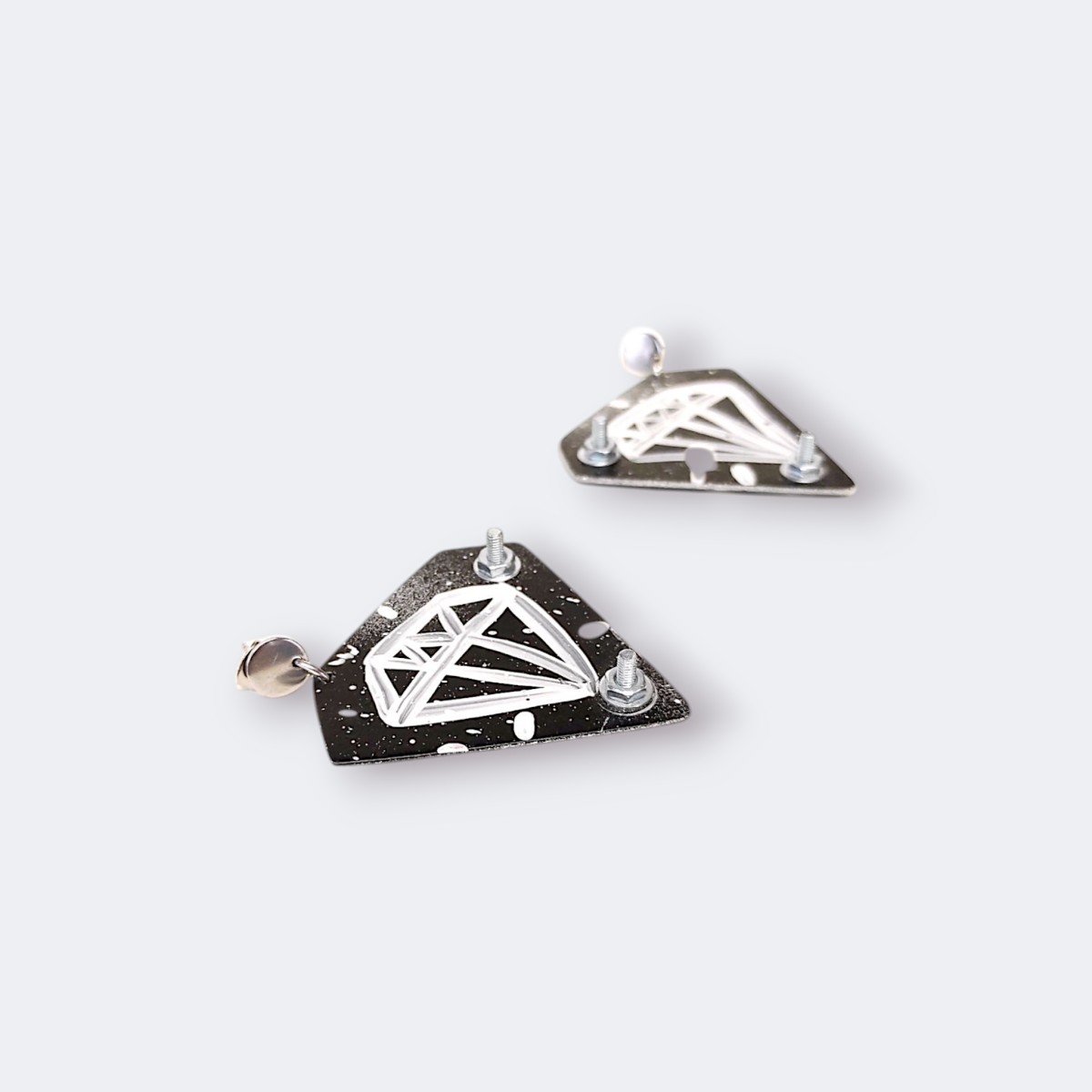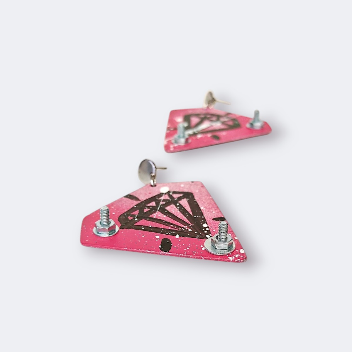Painted diamond earrings and screws. Made of aluminum, stainless steel, screws, acrylic paint, spray paint.