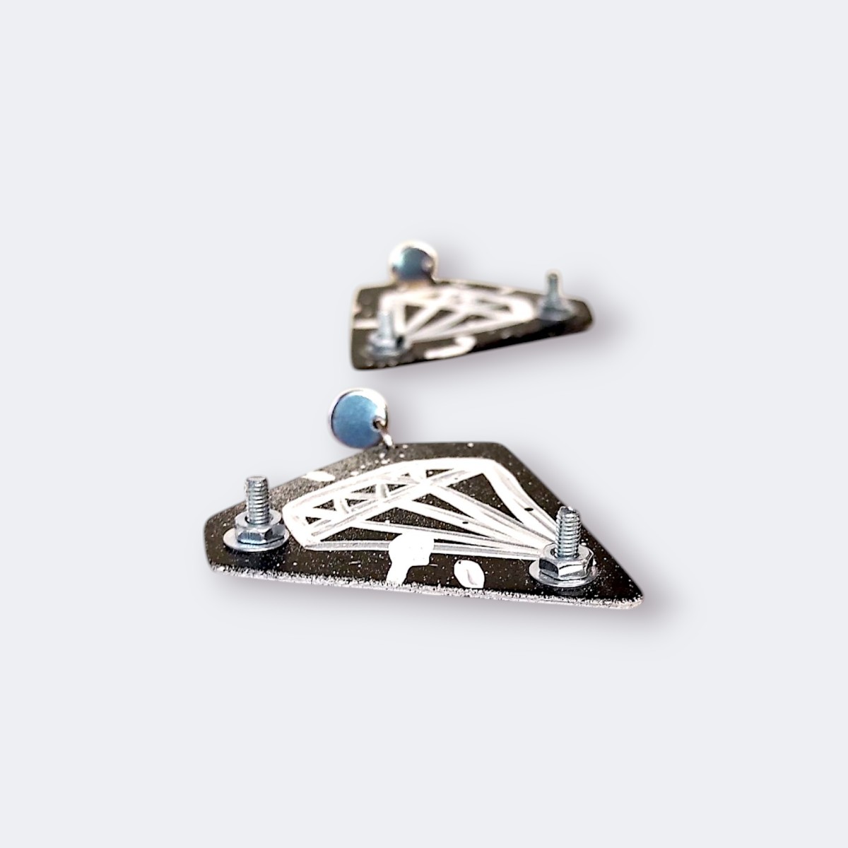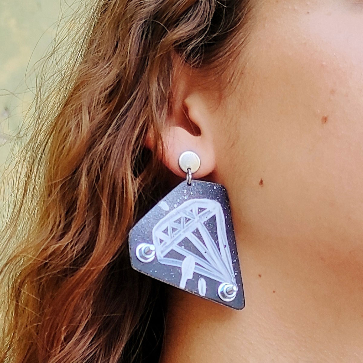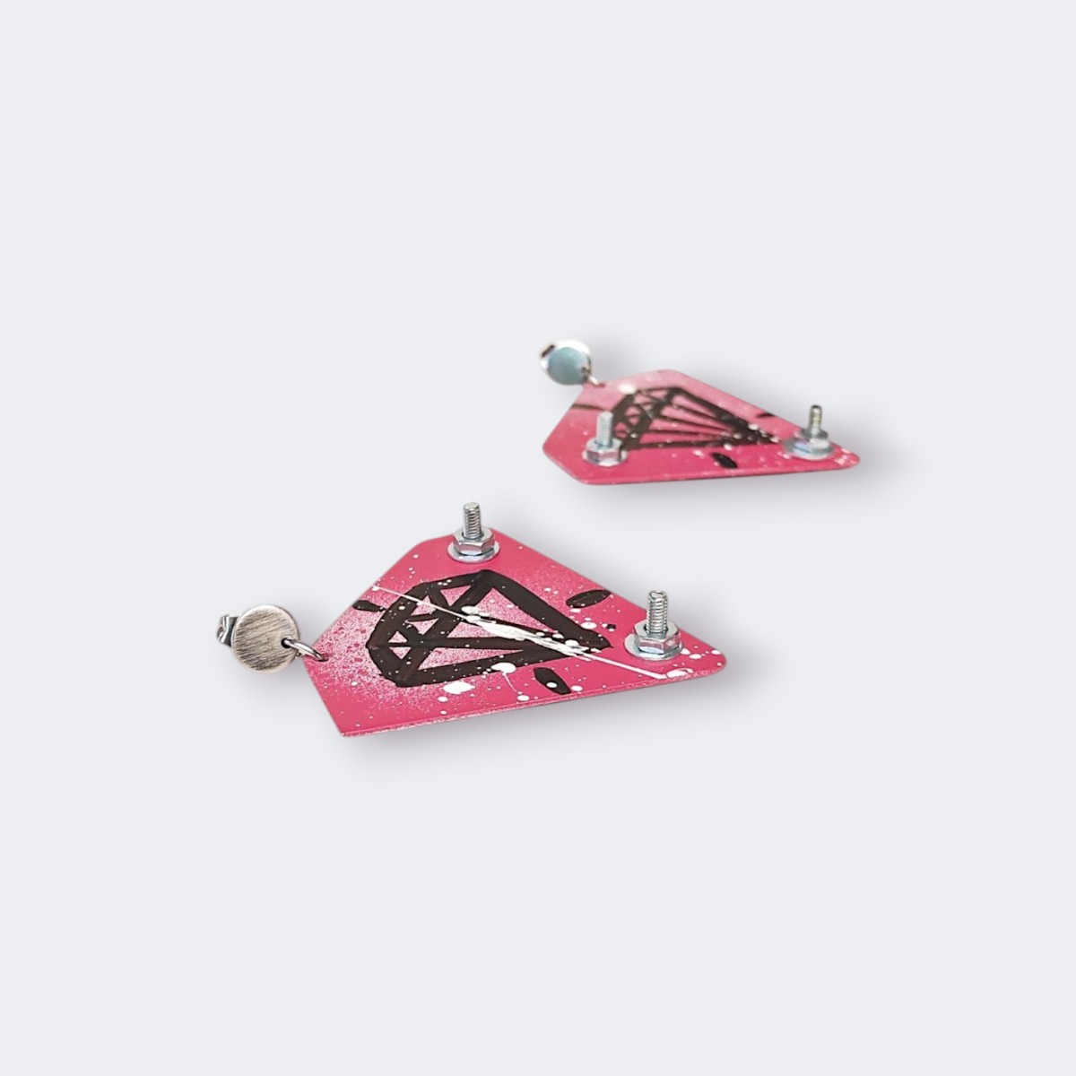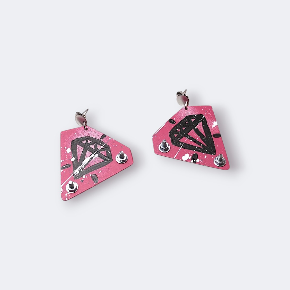 Painted diamond earrings and screws. Made of aluminum, stainless steel, screws, acrylic paint, spray paint.