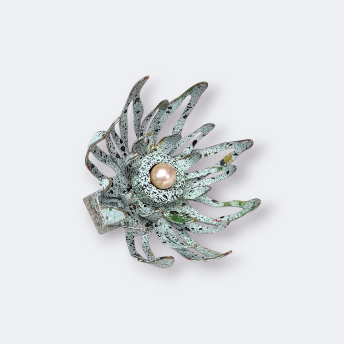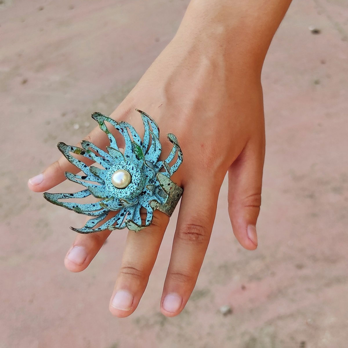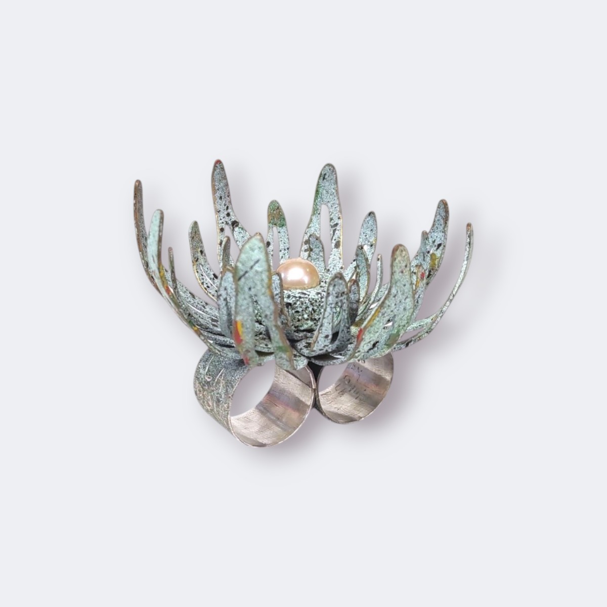 Double ring made of recycled and oxidized silver, brass, Pearl, volcanic stone, acrylic paint, spray paint.