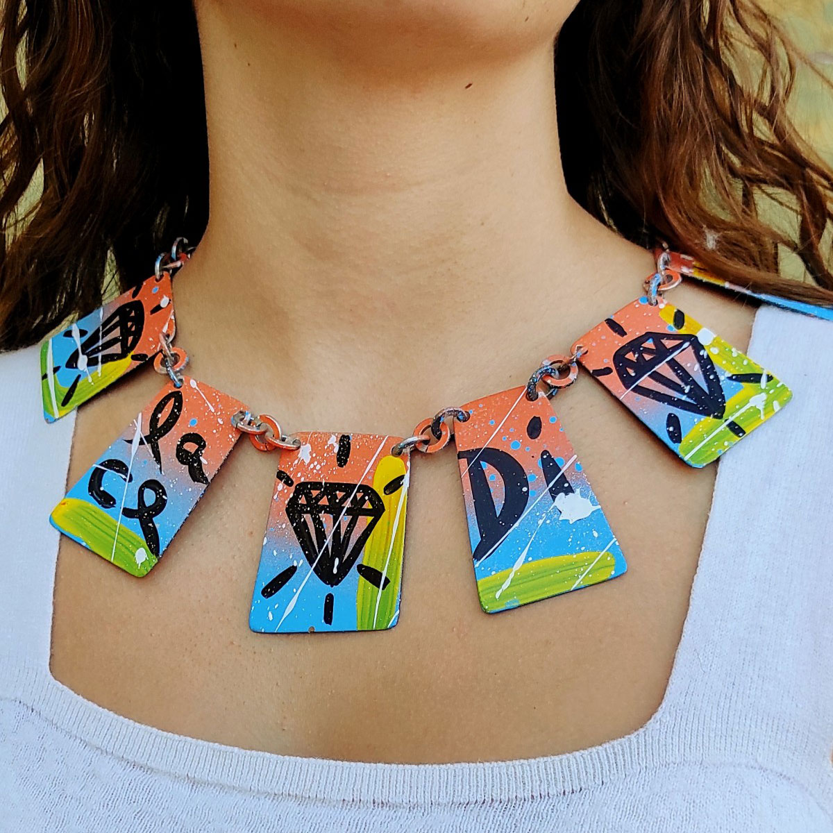 Reversible painted necklace. Made of aluminum, stainless steel, acrylic paint, spray paint.